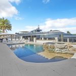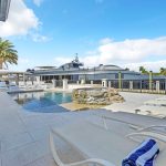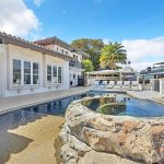 Resort-Style Pool Deck – Whitewashed concrete patio with a sparkling pool and hot tub creates an ideal backdrop for editorial, swimwear, or summer-themed shoots.