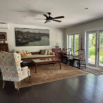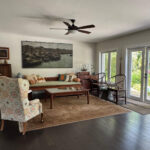 The home features an open and airy layout with abundant natural light, warm wood floors, and beautifully styled living spaces that feel both welcoming and timeless. Large windows and glass doors frame views of the surrounding greenery and lake, allowing natural light to fill the interiors throughout the day.