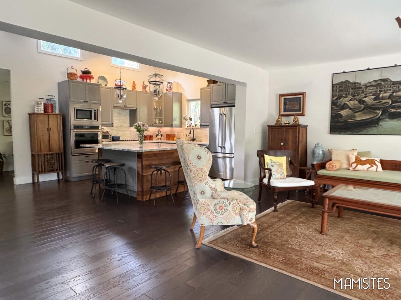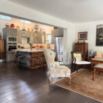 At the heart of the home is a stunning chef-style kitchen with a large marble island, modern appliances, and elegant pendant lighting. The space offers a clean yet character-rich aesthetic perfect for kitchen shoots, lifestyle content, cooking segments, and commercial filming.